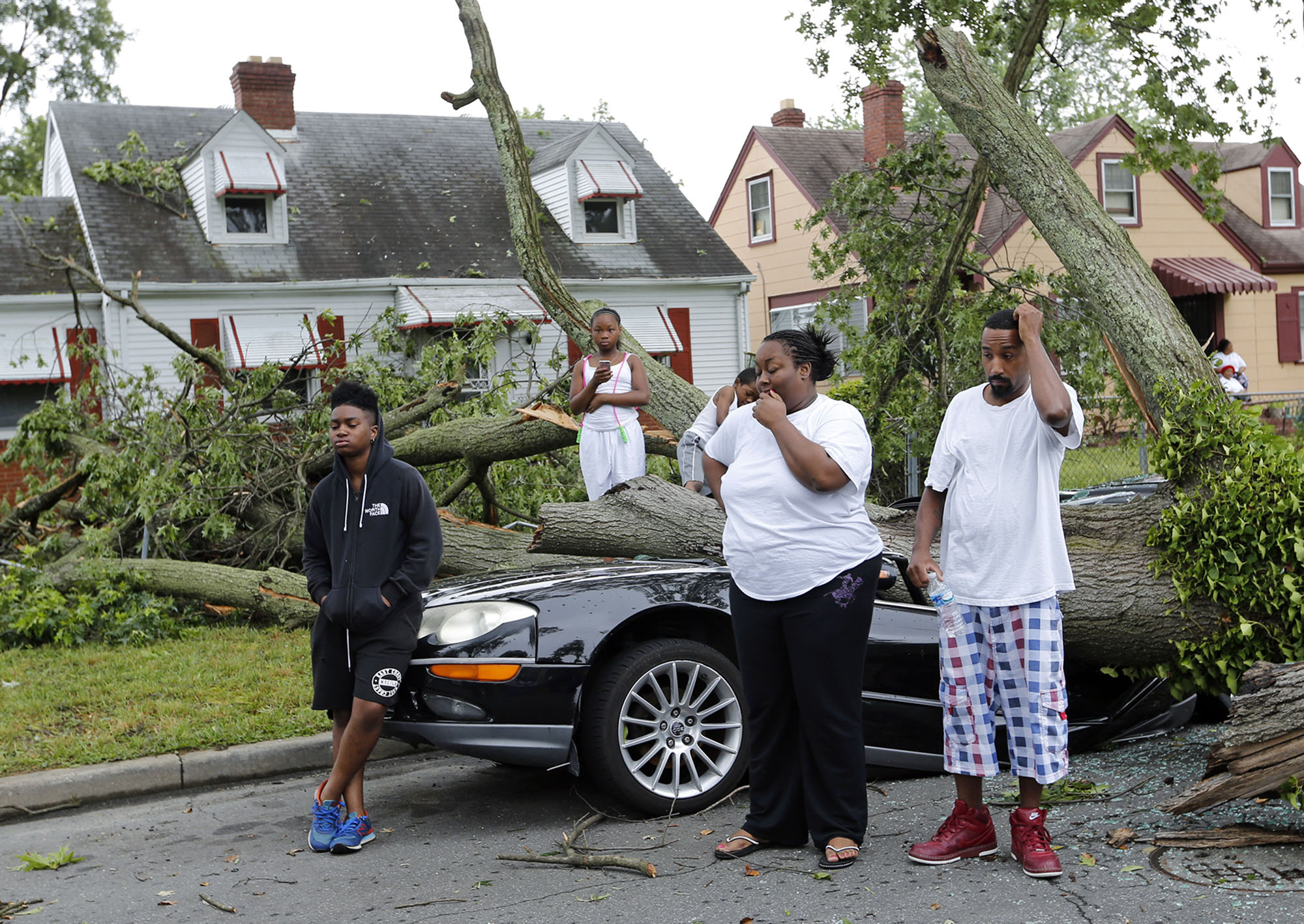 HM Spot News: P. Kevin Morley, Richmond Times-Dispatch–Ameyah Graves (far left) couldn’t believe that her mother’s car was totaled by a fallen tree during Thursday night’s storm. She and neighbors along Patrick Avenue lost their power. From left: Ameyah Graves, Jamya Mobley (11), Aquan Mobley (7), their mother Audreyel Mobley and Audreyel’s husband, Jonas Baptist.