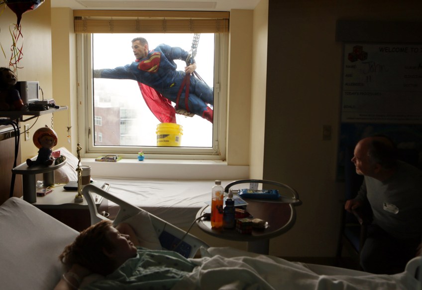 1st Place Feature:Vicki Cronis-Nohe, Virginian-Pilot–Patient John Geheren, 11, and his father Michael, right, watch in surprise from a hospital room as Wayne Barrows swings by their window on March 21, 2016. The crew of Appearances Window Cleaners of Tidewater dressed as superheroes as a treat for patients at the children’s hospital in Norfolk.