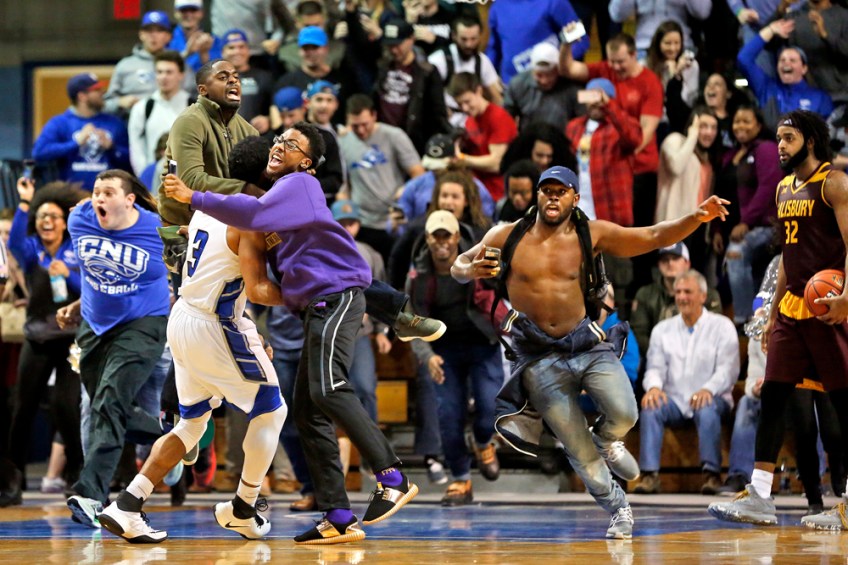 Sports 1st place, Jonathan Gruenke, The Daily Press Published June 19, 2017 at 1000 × 667 in 1st Q. CLIP CONTEST WINNERS 2017 Fans run onto the court to celebrate with Christopher Newport University’s Marcus Carter, left, after defeating Salisbury 55-53 during Wednesday’s game at the Freeman Center January 25, 2017.