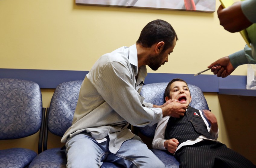 Abdul Kareem Almahdi, left, holds the mouth of his youngest son, Laith, 5, to show the dental assistant new teeth growth during an appointment on Thursday, March 30, 2017. Originally from Raqqah, Syria, the family spent four years living at a refugee camp in Jordan before being relocated to the United States. Located in the north eastern part of Syria and seized by militants in late 2013, the city the family once lived, is now the capitol of the Islamic State.
