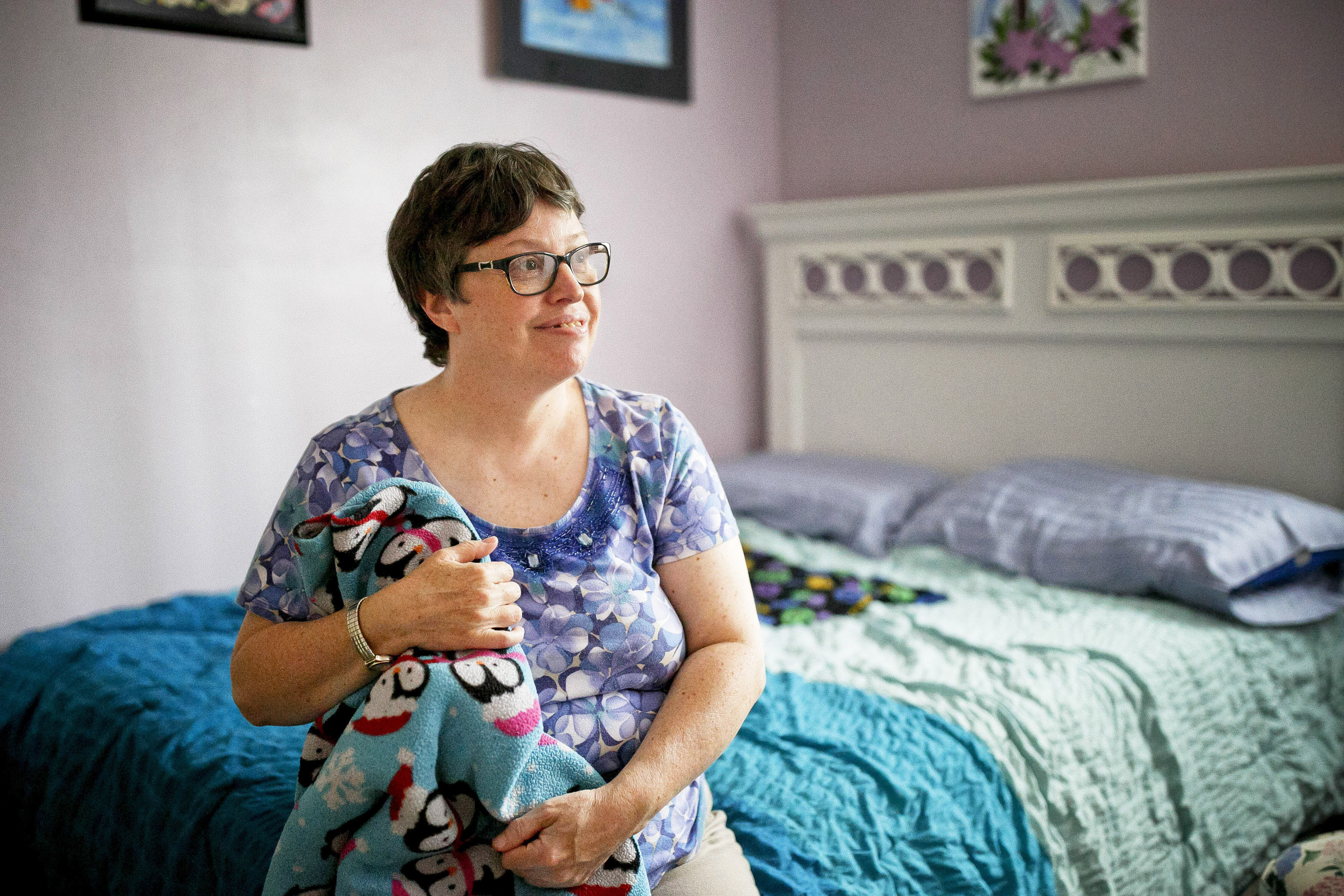 Dorothy Clark holds a comfort blanket named Happy Feet, in the bedroom of her Virginia Beach, Va., apartment on Wednesday, June 7, 2017. Clark, who has an intellectual disability, is able to live independently with the help of the Hope House Foundation.