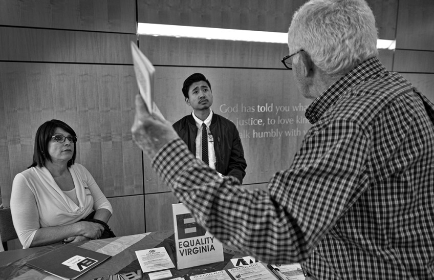 UNITED STATES – 03-18-2017: Connie Rice, a transgender woman from Leesburg, and Rae Obeyer, a transgender man with Equality Virginia, have a heated debate with a man attending the United Christian Parish in Reston during the Social Justice & Peace Conference on LGBT rights.