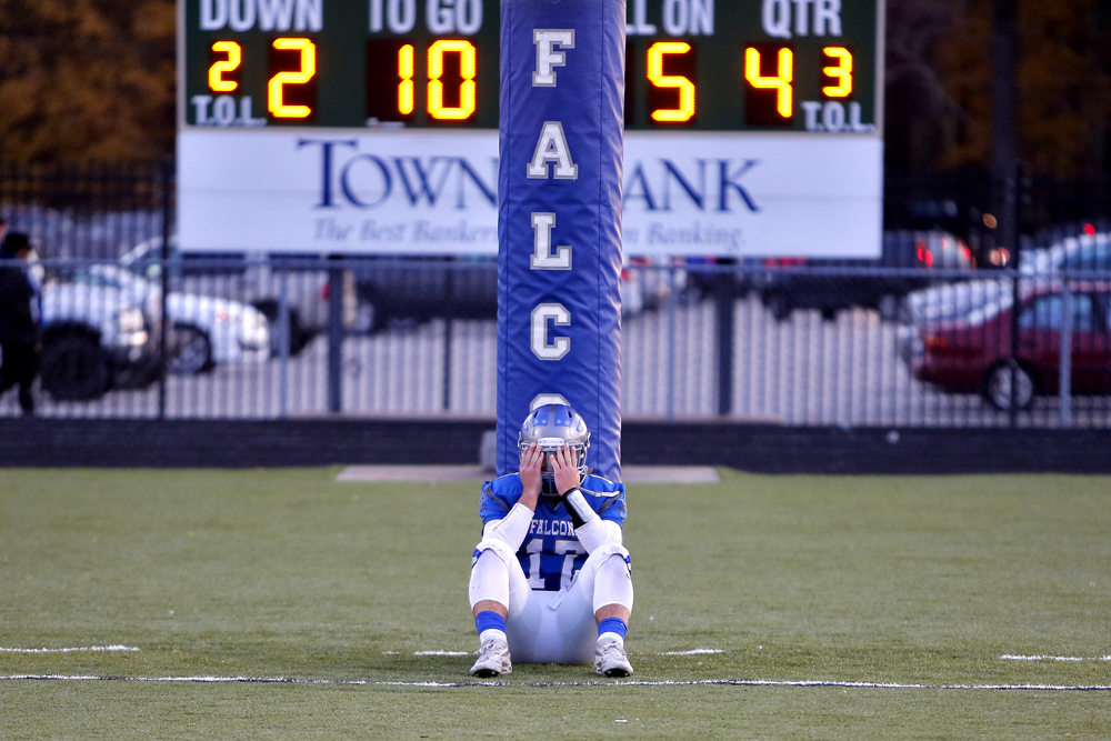 Sports 2nd Place, Jonathon Gruenke, The Daily Press Published March 6, 2018 at 1000 × 667 in Q4 Clip Contest Results York’s Cole Edwards disappointedly sits in the end zone after losing 34-6 to Hopewell during Saturday’s Region 3A championship game at Bailey Field November 25, 2017.