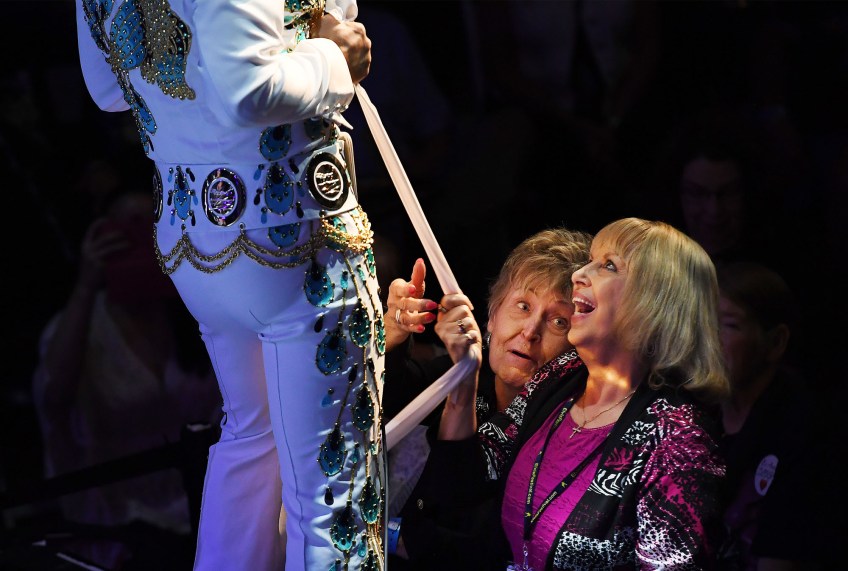 Linda Erwin, right, of Spartanburg, SC tries to secure a scarf from Elvis Tribute Artist, Diogo “Di” Light during the Images of the King World Championship at the New Daisy Theatre on Monday August 14, 2017 in Memphis, TN. August 11-19 is Elvis Week. This year marks the 40th year since Elvis Presley’s death.