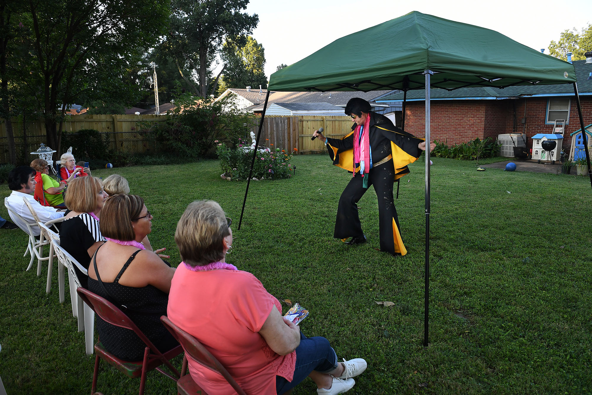 Elvis essay – Memphis, TN Published March 18, 2018 at 2000 × 1333 in 2017 POY-VA Feature Picture Story Elvis Tribute Artist, Bruce Hanson of Rice Lake, WI, performs in the backyard of Bud and Mary Stonebraker on Friday August 11, 2017 in Memphis, TN. The couple have lived directly behind Elvis Presley’s Graceland for 22 years.