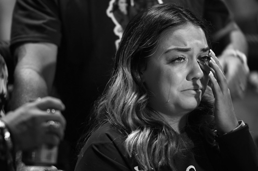 Natalia Baca cries as she attends a homecoming football game at Faith Lutheran Middle School and High School with her twin sister, Gianna Baca on Friday October 06, 2017 in Las Vegas, NV. Natalia and her sister, Gianna were both shot by suspected gunman, Stephen Paddock while attending the Route 91 Harvest Festival.