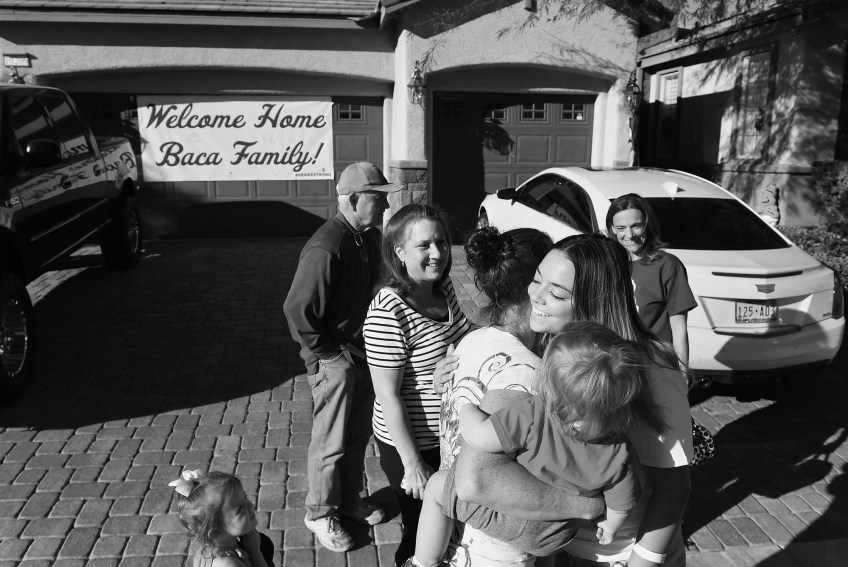 Natalia Baca, right center, is hugged by neighbor, Amy Lubitz while she holds her son, Bennett Lubitz, 3, as Natalia arrives home from Sunrise Hospital and Medical Center as her mother, Cindy Baca is seen at right on Friday October 06, 2017 in Las Vegas, NV. Natalia Baca and her twin sister, Gianna were both shot by suspected gunman, Stephen Paddock while attending the Route 91 Harvest Festival.
