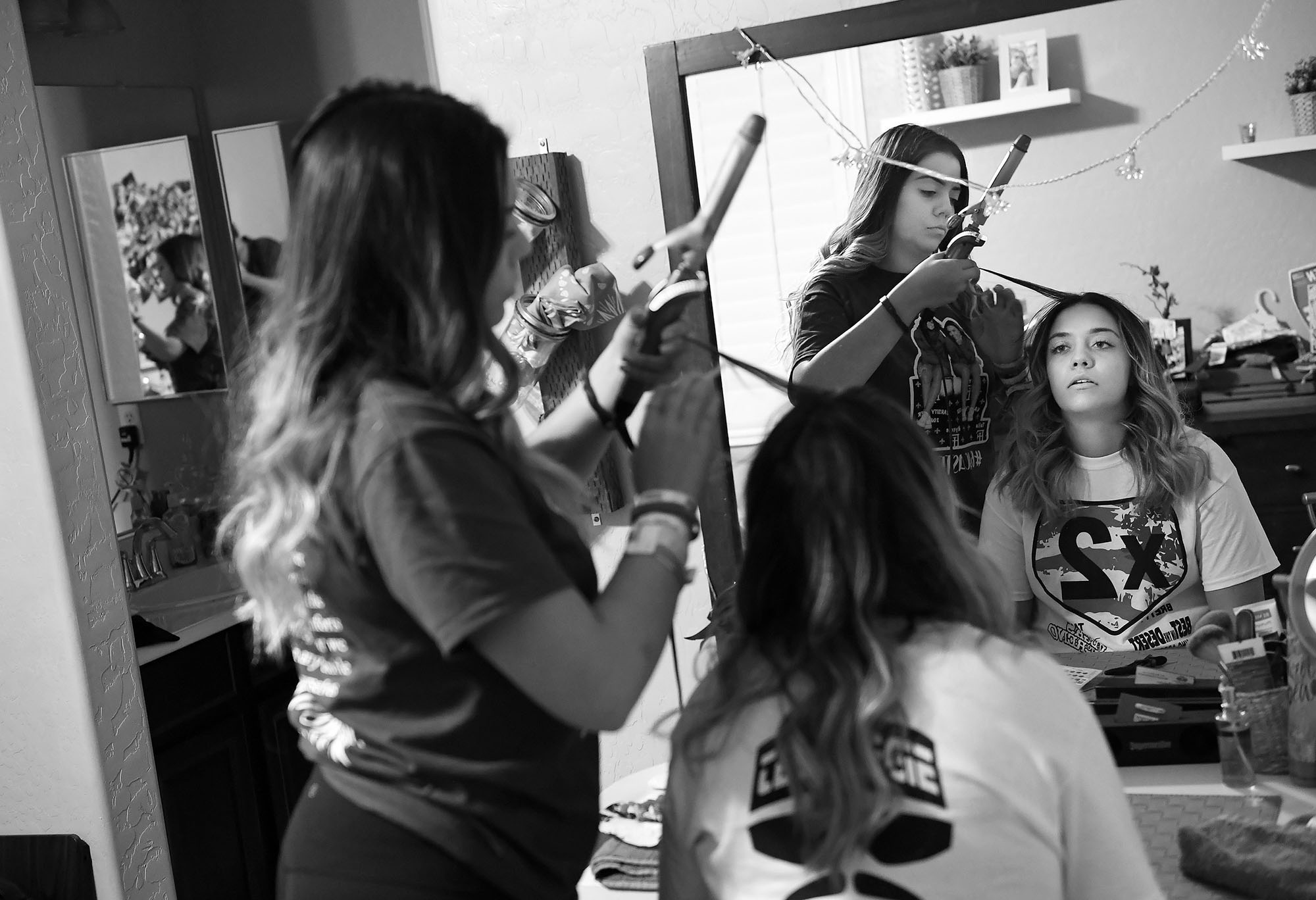 Gianna Baca, left, helps her twin sister, Natalia Baca, right center, with her hair at their family’s home before they attended a homecoming football game at Faith Lutheran Middle School and High School on Friday October 06, 2017 in Las Vegas, NV. Natalia and Gianna were both shot by suspected gunman, Stephen Paddock while attending the Route 91 Harvest Festival.