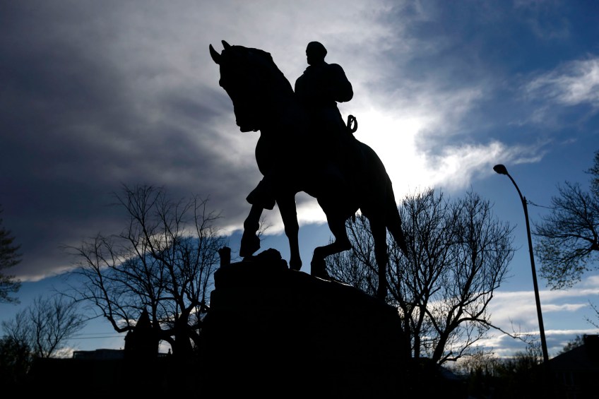 News Picture Story 2nd Place Ryan Kelly/Daily Progress Published March 18, 2018 at 2000 × 1333 in 2017 POY-VA News Picture Story A statue depicting Confederate general Robert E. Lee stands over Lee Park in downtown Charlottesville on April 7, 2016.