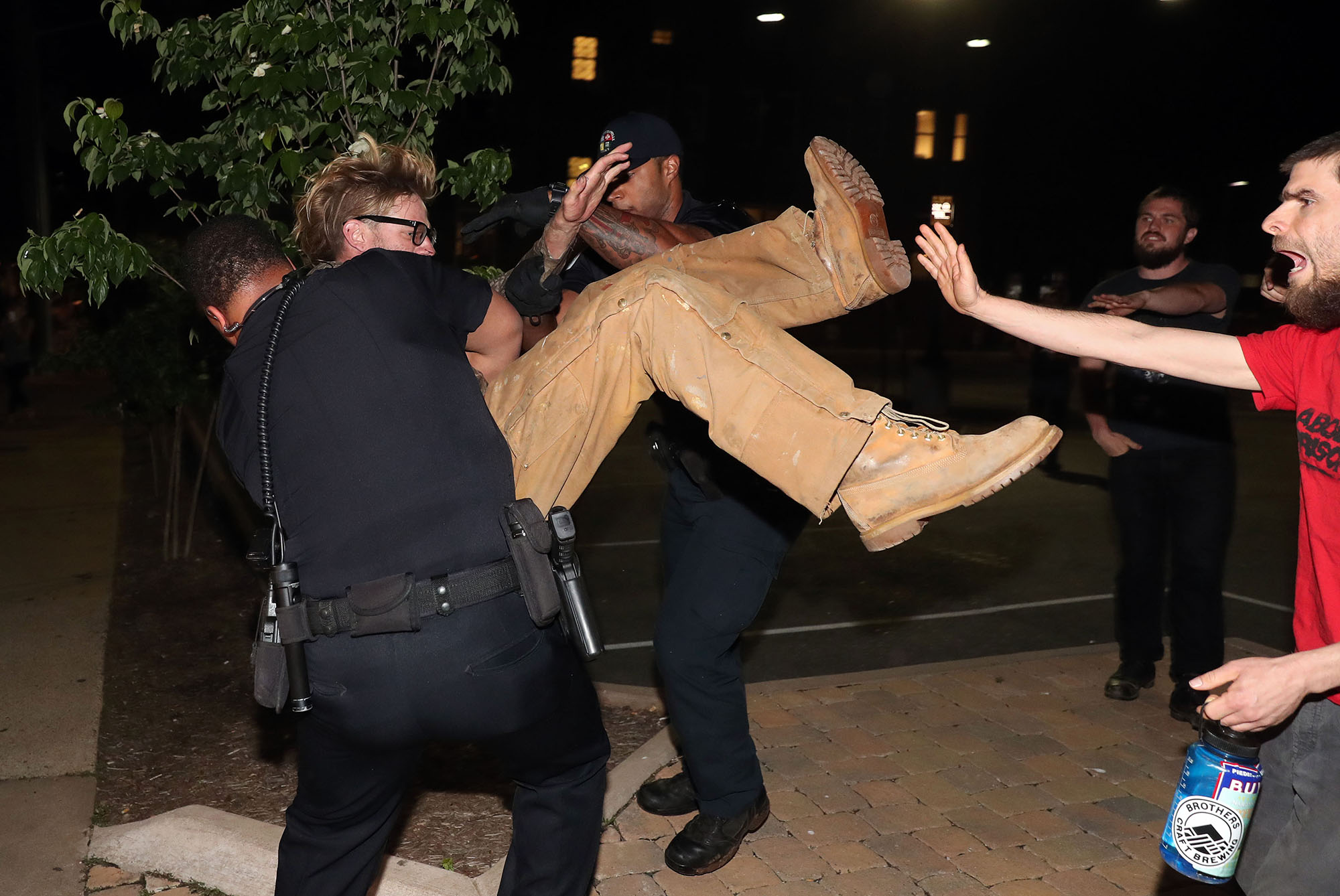 nps-001-charlottesville03 Published March 18, 2018 at 2000 × 1338 in 2017 POY-VA News Picture Story Police make an arrest during a counter-protest to “take back Lee Park” on Sunday, May 14, 2017 after torch-bearing protesters met up at the Charlottesville park on Saturday night.