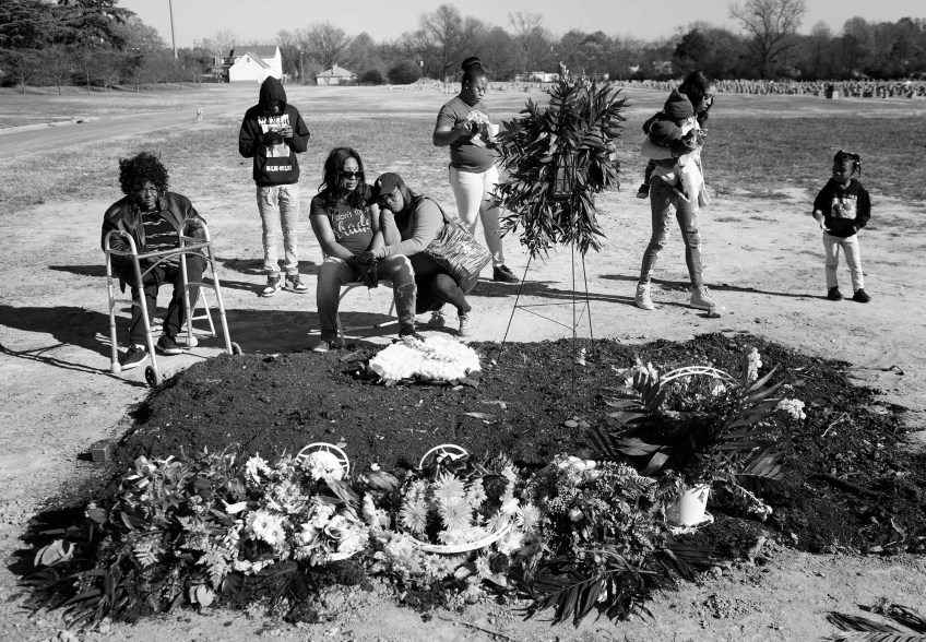 Rachelle Wells and her long time friend, Adrienne Bullock, both sitting, comfort each other as they visit grave sites of Wells’ daughter, Renita Williams, grandson, Jaishaun Wells, and Bullock’s son, Deonte “Max” Bullock, with other family members at Oakwood Cemetery in Richmond on Wednesday, November 29, 2017. They lost their children and grandson about 40 days apart by two separate crimes.