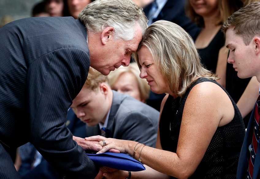 Gov. Terry McAuliffe hands Karen Cullen, the widow of Lt. H. Jay Cullen, the flag during his funeral service Saturday, August 19, 2017, at Southside Church of the Nazarene. Their sons Max Cullen, left, and Ryan Cullen, right, sit with her. Cullen was one of two State Troopers who were killed in a helicopter crash last weekend during the white supremacist rally in Charlottesville.