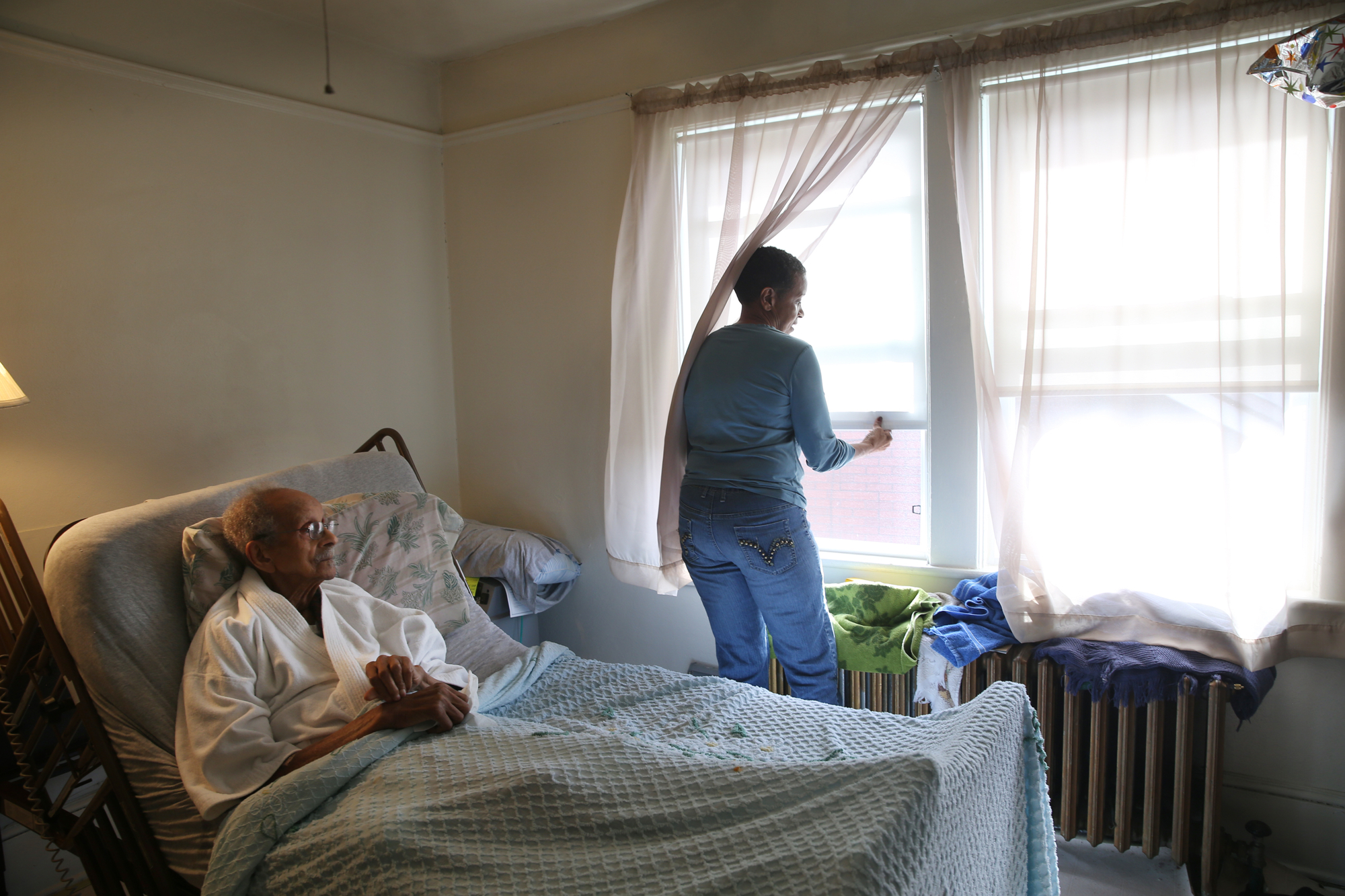 Lee Graves, 102, rests in his bedroom at his home along Orange Avenue as one of his daughter’s Charlene Graves, of Charlotte, NC., adjusts a shade as the sun begins to set. Graves ‘s four children, rotate care of him as he is aging at home. He was in hospice care and graduated from it when he was 101. Then he was in it again due to issues eating. Now, he’s eating again. He takes care of his own personal hygiene, still can walk down his stairs and still uses an exercise bicycle.