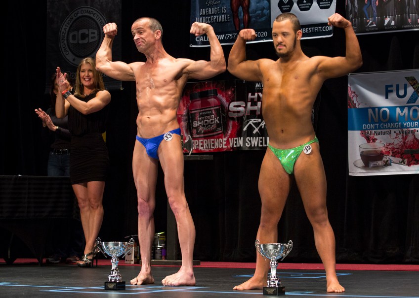 Steve Alexy ,43, of Franklin,VA and Jon Atkins ,19, right, pose for the crowd after receiving their trophies Saturday, Feb.18, 2017 on stage at The American Theatre during The Body Sculpting Open Championships. Atkins has worked with personal trainer Joe Hartfelder for the past year in preparing for the competition. Atkins and Alexy who has Cerebral palsy, competed in the Men’s Physique Challenged category. Alexy won first place and Atkins, second in the category.