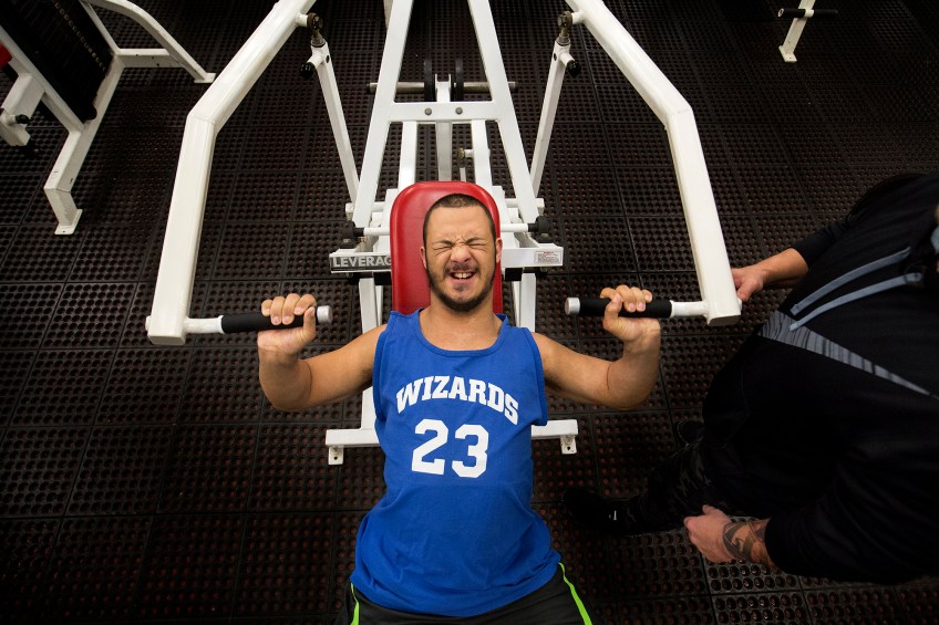Jon Atkins,19, of Virginia Beach works out at Houze Of Champions gym in Virginia Beach under the direction of his personal trainer, Joe Hartfelder Wednesday, Feb. 15, 2017 just days before his first body building competition in Hampton for The Body Sculpting Open Championships. Atkins, who has Down Syndrome has worked with Hartfelder for the past year in preparing for the competition.