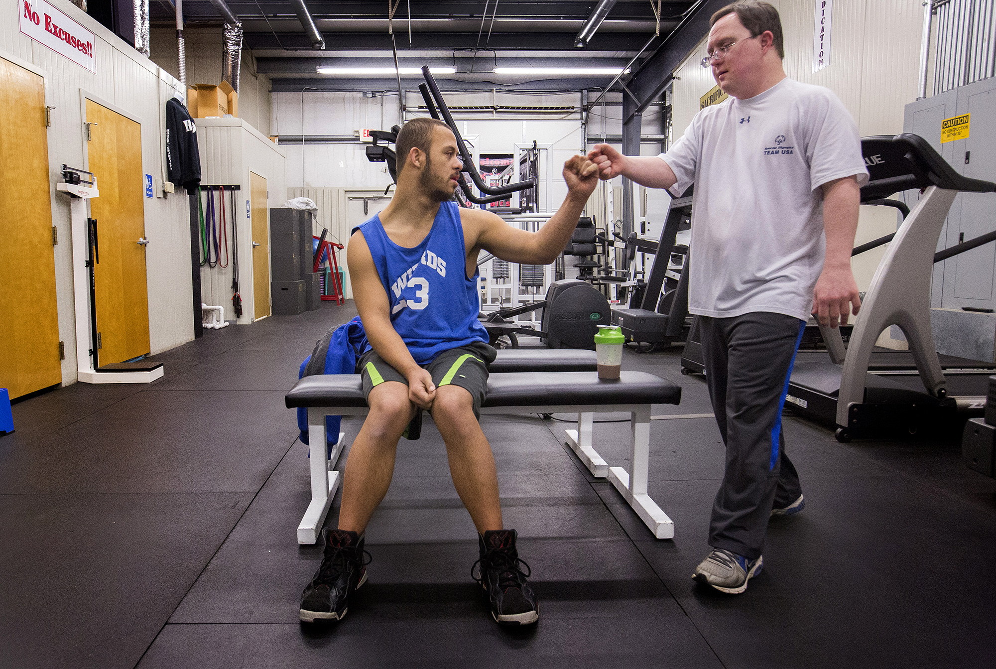 Jon Atkins,19, left, greets his friend Nate Morell of Virginia Beach, right, with a fist bump before their work out at Houze Of Champions gym in Virginia Beach under the direction of personal trainer, Joe Hartfelder Wednesday, Feb. 15, 2017. Atkins was working out just days before his first body building competition in Hampton for The Body Sculpting Open Championships at The American Theatre. Atkins, who has Down Syndrome has worked with Hartfelder for the past year in preparing for the competition. Morell also has Down Syndrome.