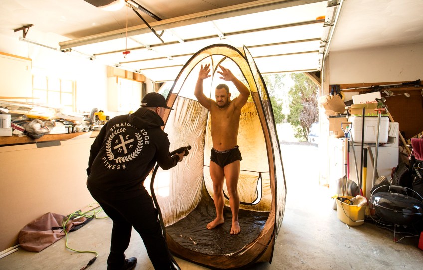 Personal trainer, Joe Hartfelder, owner of Straight Edge Fitness gives Jon Atkins,19, a spray tan Friday afternoon, Feb.17,2017 in preparation of Atkins’ first body building competition. Hartfelder set up a tent in the garage of Atkins’ grandparents, Jimmey and Cindy Sykes in Virginia Beach for the tanning. Atkins competed Saturday, Feb.18, 2017 in his first body building competition, The Body Sculpting Open Championships at The American Theatre. Atkins, who has Down Syndrome has worked with Hartfelder for the past year in preparing for the competition.