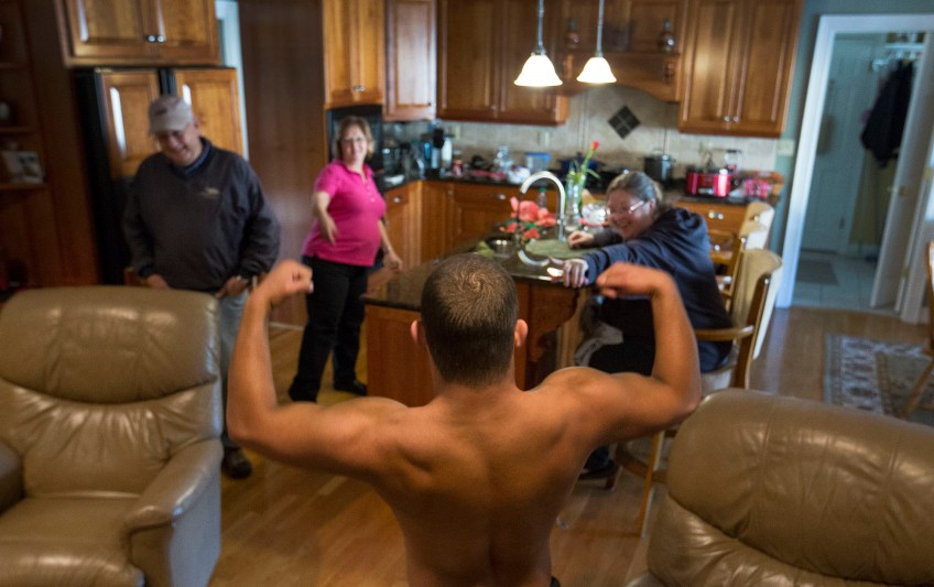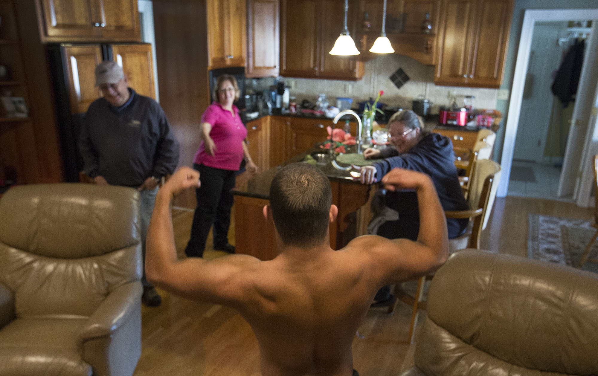 Jon Atkins,19, shows his routine to his grandparents, Jimmey and Cindy Sykes and his mother, Lisa Dudley, right, as he waited by the fireplace for his spray tan to dry Friday afternoon, Feb.17,2017. Atkins would compete in his first body building competition Saturday, Feb.18, 2017 during The Body Sculpting Open Championships at The American Theatre. His personal trainer, Joe Hartfelder came to his grandparents house to give Atkins a spray tan in preparation for the body building competition.