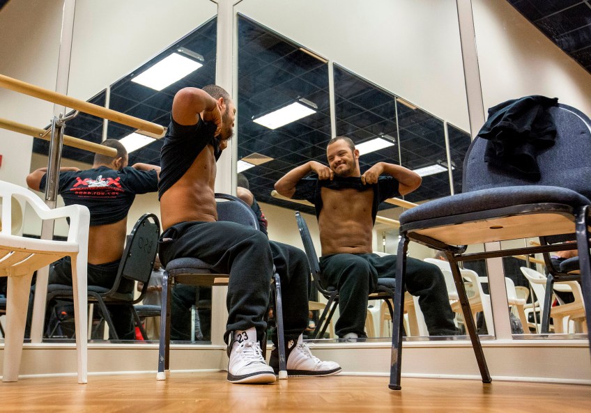 Jon Atkins,19, admires his abs in a room off the stage at The American Theatre where athletes gathered for the Body Sculpting Open Championships Saturday morning, Feb. 18, 2017. Atkins, who has Down Syndrome has worked with personal trainer Joe Hartfelder for the past year in preparing for the competition. Atkins competed in the Men’s Physique Challenged category.