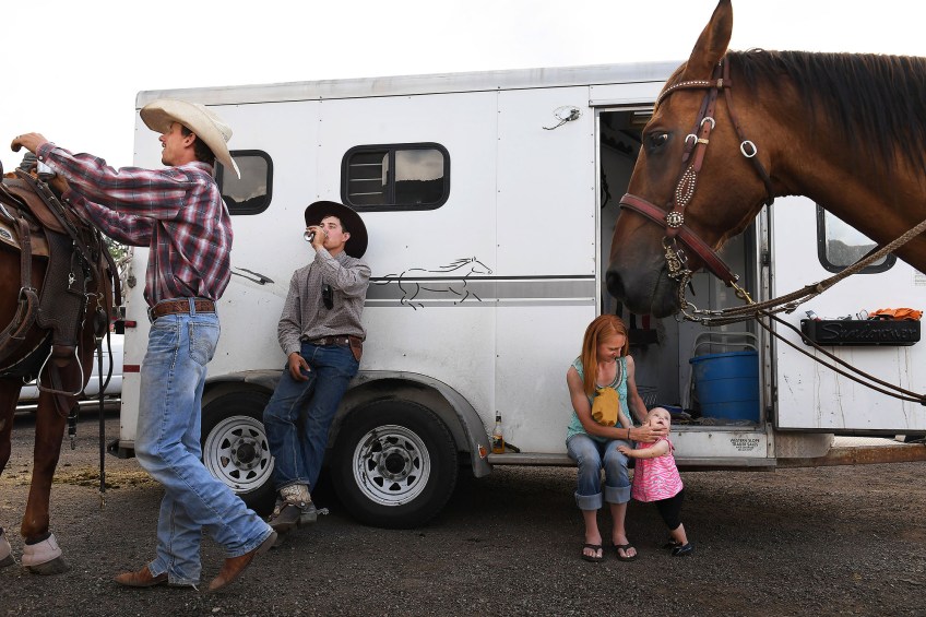 Evan Koster attends to his horse while standing next to J.D. Slagowski as Evan’s wife, Maggee Koster holds their daughter, Raelyn Koster, 1, prior to the start of the Snowmass Rodeo on Wednesday July 19, 2017 in Snowmass Village, CO. This is the 44th year for the weekly rodeo that runs from mid-June through August.