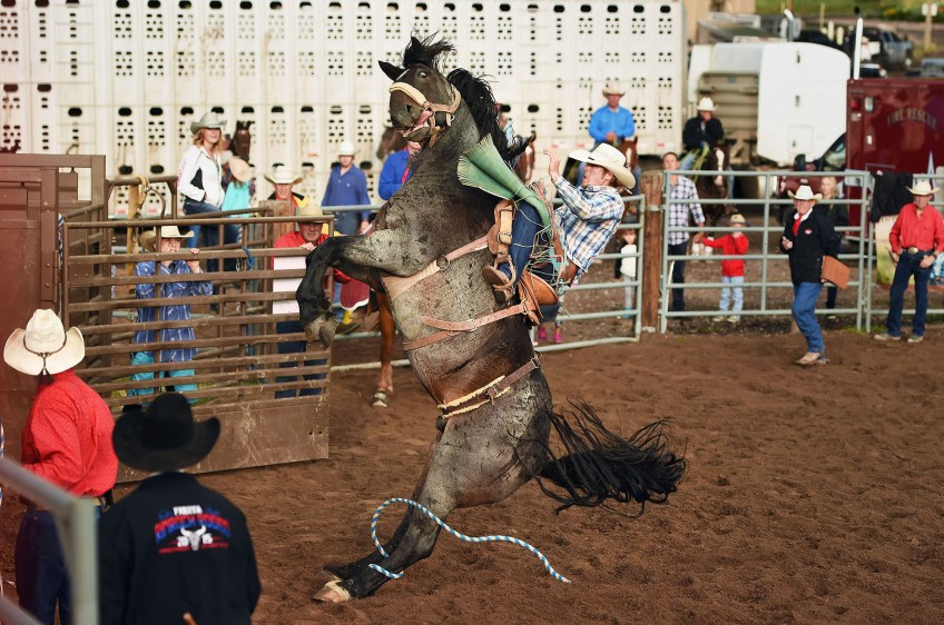 Garrett Buckley competes in the Saddle Bronc Riding competition at the Snowmass Rodeo on Wednesday July 19, 2017 in Snowmass Village, CO. Buckley got another ride after this first ride ended quickly as the horse he was riding went straight up and over after coming out of the gate. This is the 44th year for the weekly rodeo that runs from mid-June through August.