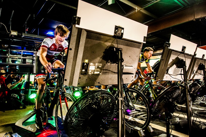 ROANOKE, VA – MAR 9: Ben races in a virtual race using an app called Zwift against regional cycling talent, including Jeremiah Bishop, right, at Soaring Ridge Brewery on Thursday, Mar. 9, 2017 in Roanoke, Va. Bishop met Ben the previous year at a Gran Fondo ride that Bishop hosts, and noticed Ben’s talents. Bishop has since acted as a mentor.