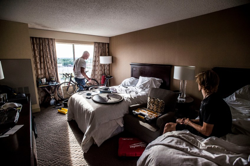 sps-018-theclimb09 Published March 18, 2018 at 2000 × 1331 in 2017 POY-VA Sports Picture Story LOUISVILLE, KY – JUN 28: Ben rests his legs and watches his dad work on the Time Trial bike he’ll be using the next day for the USA Cycling National Championships race in Louisville, Ky.on Wednesday, June 28, 2017.