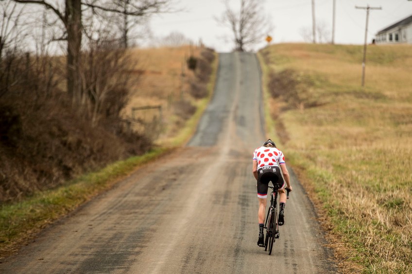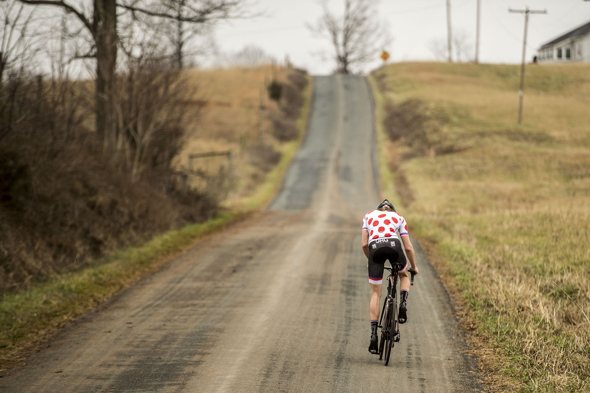 sps-018-theclimb13 Published March 18, 2018 at 2000 × 1333 in 2017 POY-VA Sports Picture Story ELON, VA – JAN 21: Ben, wearing a “King of the Mountains” jersey he earned at Jeremiah Bishop’s Gran Fondo, makes his way up a climb in Amherst County during a training ride on Saturday, Jan. 21, 2017 in Lynchburg, Va.
