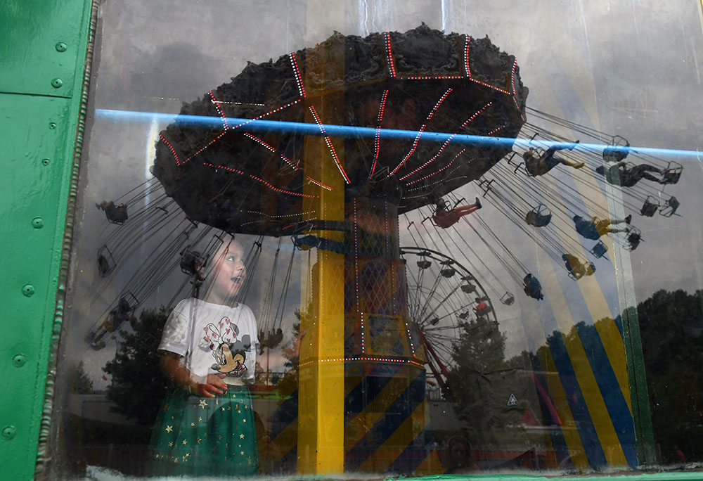 2nd PLACE FEATURE: Matt McClain, Washington Post–Emily Barroso, 3, looks out a window of the Lily’s Storyland attraction while people on the Wave Swinger ride are reflected at a carnival that was part of the Celebrate Fairfax festival on Sunday June 10, 2018 in Fairfax, VA.