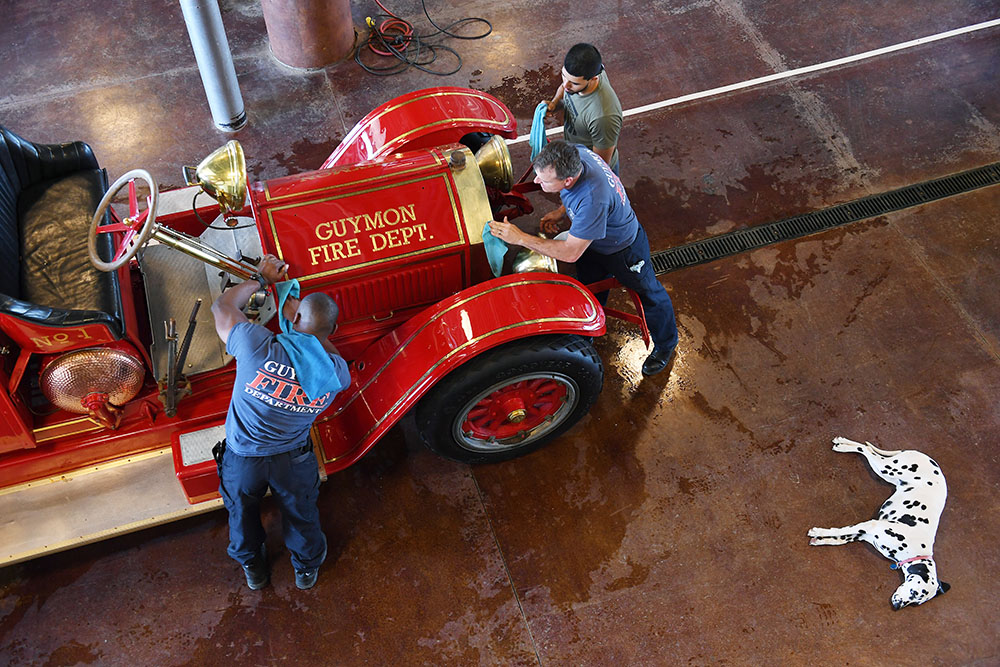 3rd Place Feature: Matt McClain, Washington Post–Guymon Fire Department firefighters, Alan Williams, left, captain Dennis Dudley and volunteer, Lupe Avalos, 20, work on cleaning up a vintage fire truck at Station 1 on Thursday May 03, 2018 in Guymon, OK. The truck was going to be used in the Pioneer Days parade. The department has had success finding volunteer firefighters.
