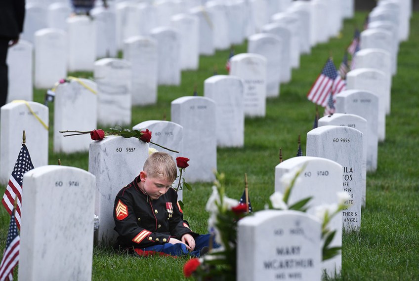 1st PLACE NEWS: MATT MCCLAIN, WASHINGTON POST Christian Jacobs, 7, sits against the headstone of his father, U.S. Marine Corps Sgt. Christopher James Jacobs as he visits in observance of Memorial Day at Arlington National Cemetery on Monday May 28, 2018 in Arlington, VA. Christopher died during a training exercise in 2011.