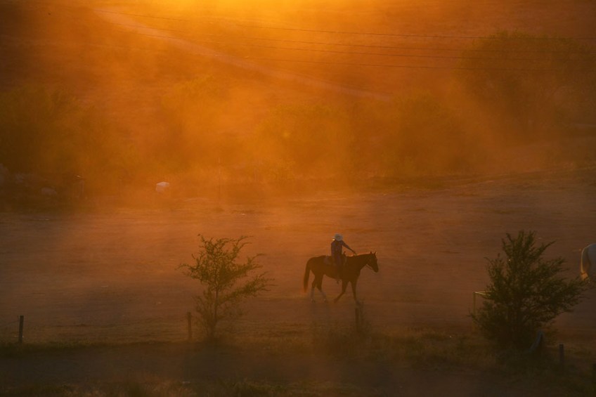 HM Feature Matt McClain, Washington Post –A rodeo participant warms up a horse as the setting sun illuminates dust during an evening rodeo that was part of Pioneer Days on Saturday May 05, 2018 in Guymon, OK. This was the 86th year of the event.