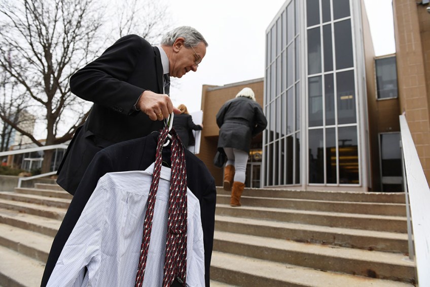 Gary Benjamin carries spare clothes for Ansly Damus after Gary and others rode a bus from Cleveland, OH in order to attend a hearing for Damus at the Ann Arbor Federal Building on Wednesday November 28, 2018 in Ann Arbor, MI. Damus, who is from Haiti has been detained since 2016 after coming to the United States to seek asylum. Ansly was released on Friday to live with Benjamin and his wife, Melody Hart.