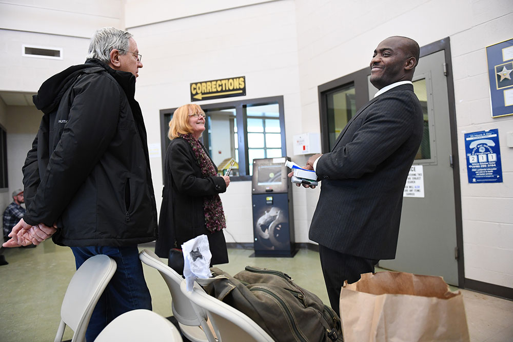 Ansly Damus picks up his belongings with Gary Benjamin and his wife, Melody Hart at the Geauga County Sheriff’s Office on Friday November 30, 2018 in Chardon, OH. Damus, who is from Haiti has been detained since 2016 after coming to the United States to seek asylum. Ansly spent most of his time in detainment at the Geauga County Safety Center located on the same grounds at the Sheriff’s office. Friday he was released from an ICE facility in Brooklyn Heights, OH and had to travel to Chardon, OH to get his belongings. Ansly was released on Friday to live with Benjamin and Hart.