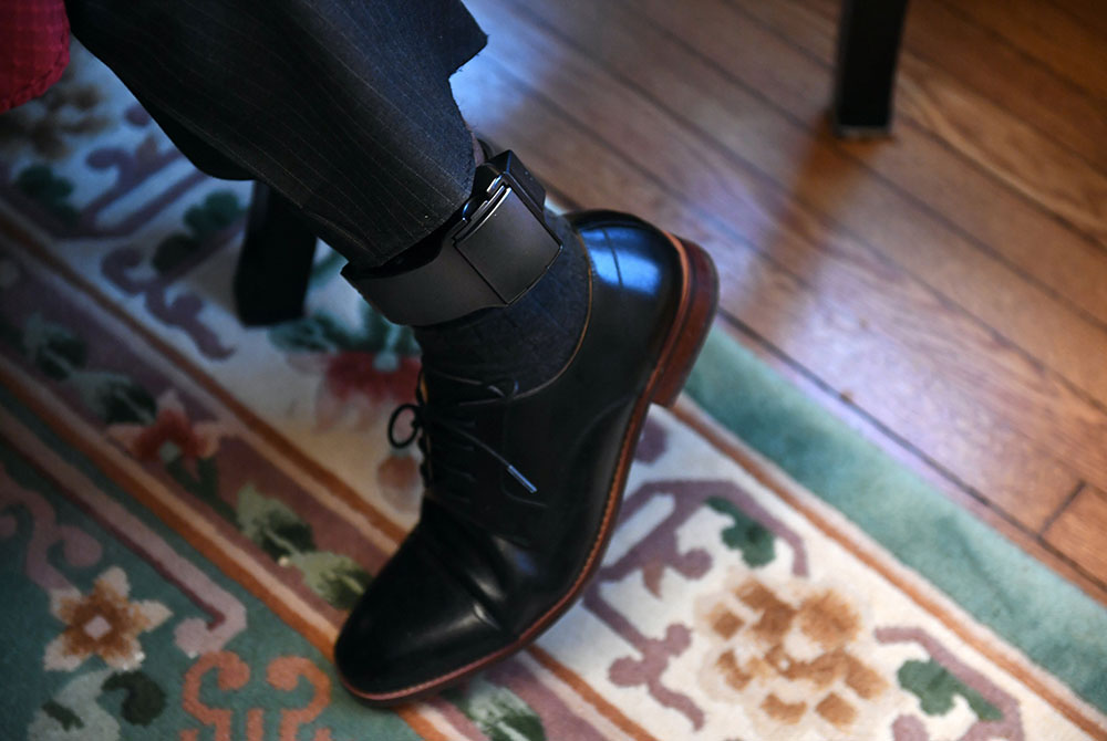 Ansly Damus wears an ankle monitor as he sits in the home of Gary Benjamin and his wife, Melody Hart on Friday November 30, 2018 in Cleveland Heights, OH. Damus, who is from Haiti has been detained since 2016 after coming to the United States to seek asylum. Ansly was released on Friday to live with Benjamin and Hart.