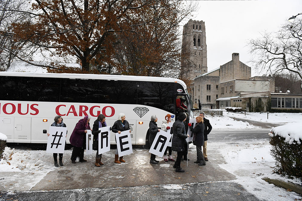 Supporters of Ansly Damus board a bus to attend a hearing for Damus on Wednesday November 28, 2018 in Cleveland Heights, OH. The hearing was in Ann Arbor, MI. Damus, who is from Haiti has been detained since 2016 after coming to the United States to seek asylum.