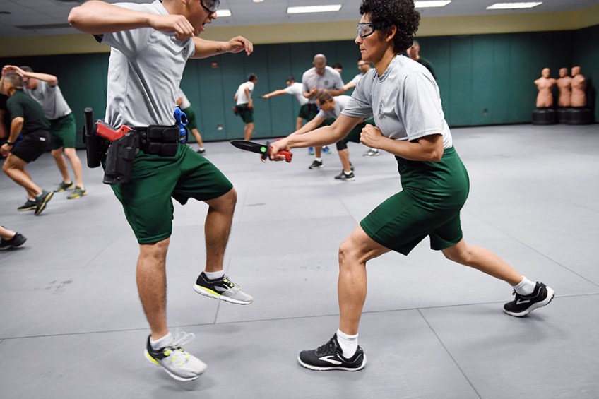 Felipe Chavez, left, jumps away from Silvia Gutierrez Gomez as they take part in edge weapons training at the United States Border Patrol Academy on Thursday August 30, 2018 in Artesia, NM. The academy is on the grounds of the Federal Law Enforcement Training Center.