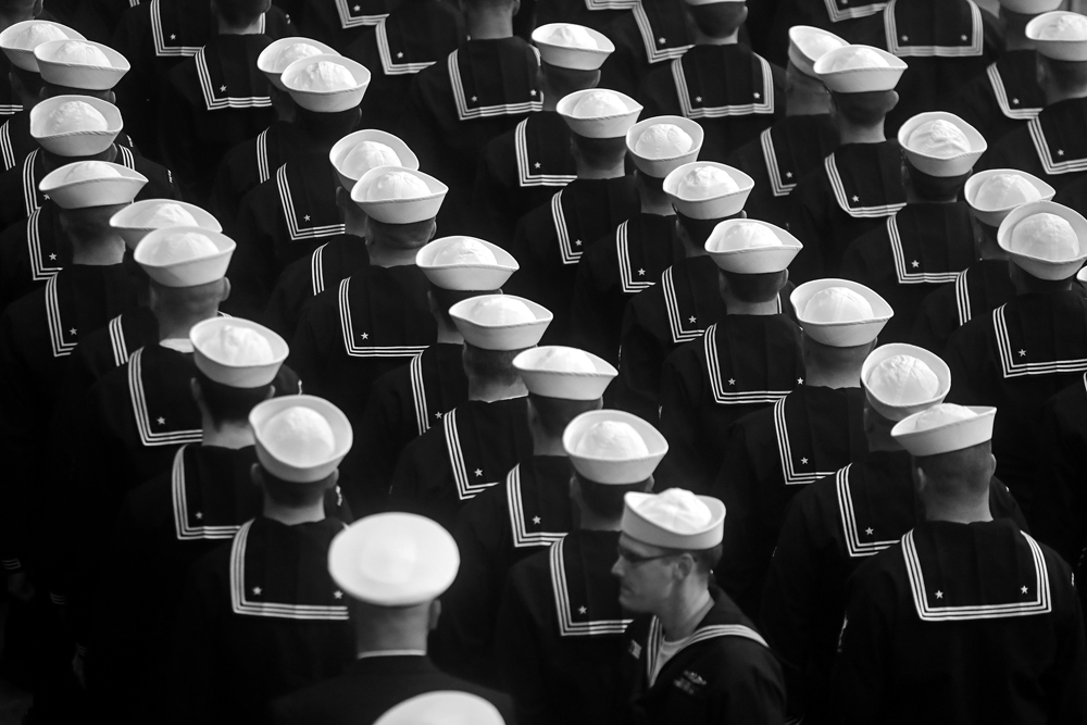 Sailors of the submarine Delaware stand in formation during the christening ceremony at Newport News Shipbuilding Saturday morning October 20, 2018. Delaware will be the ninth Virginia-class submarine that Newport News has delivered — 18th in the entire class.