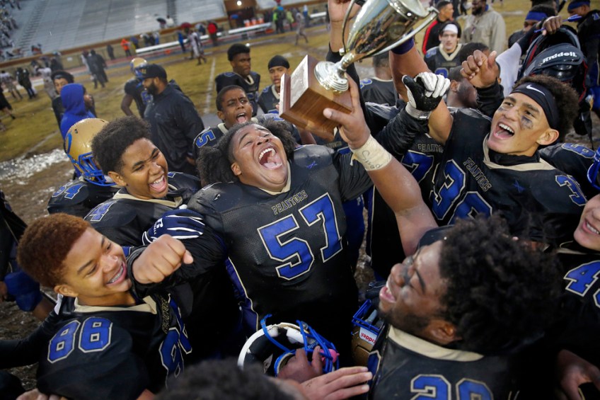 1st Place Sports: Jonathon Gruenke, Daily Press—Phoebus’ Ramel Lewis, center, other players celebrate with the trophy after defeating Norcom 7-6 in triple overtime during Saturday afternoon’s Class 3 Region A championship game at Darling Stadium November 24, 2018.