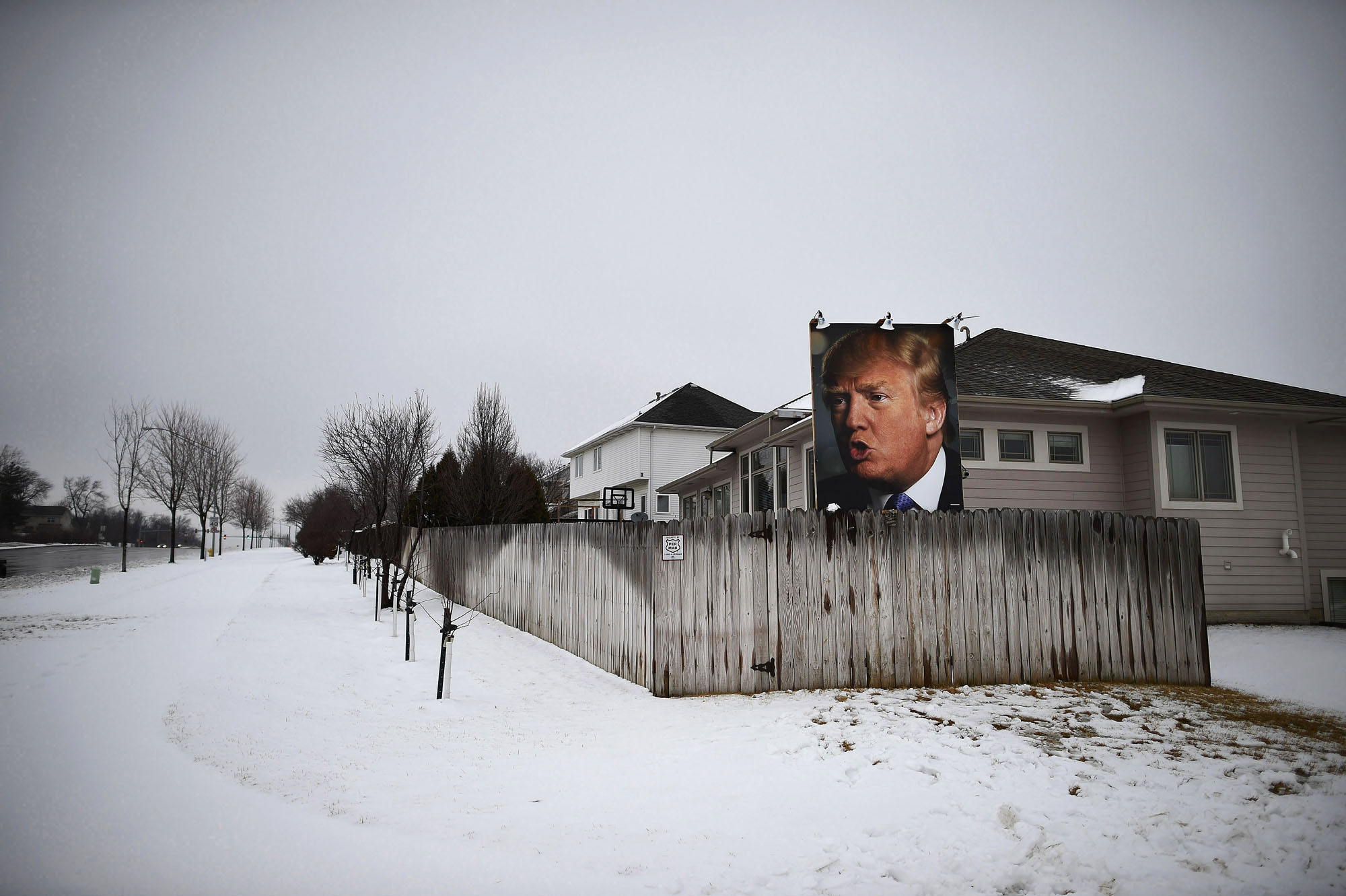 2ele-020-trump01 Published March 26, 2017 at 2000 × 1331 in 2ele-020-trump01 2nd Place Election: Matt McClain, Washington Post–A photograph of presidential candidate, Donald Trump is seen in a residential neighborhood on Tuesday February 02, 2016 in West Des Moines, IA.