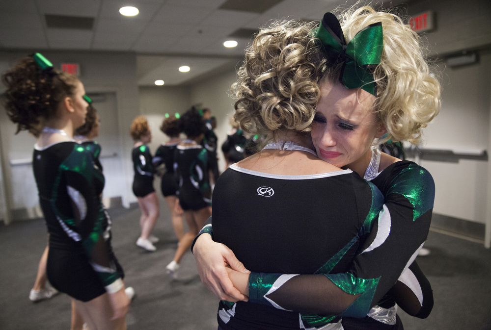Kelsey Sims, right, a senior on Wilson Memorial High School’s cheerleading team, embraces her classmate Taylor Bailey moments after completing their Group 2A state championship winning performance in Richmond on Saturday, Nov. 8, 2014. “It’s the best and worst feeling I’ve ever felt in my life,” said Sims, describing the final performance as perfect but bittersweet as it is her last with the team.
