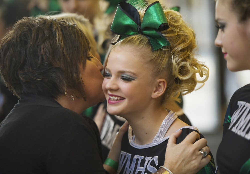 Cheer State Final Published April 2, 2015 at 1000 × 696 in Cheer State Final Wilson Memorial High School cheerleading coach Renae Bailey, left, gives one of her athletes, Rachel VanFossen, a kiss on the cheek before their performance in the Group 2A cheerleading championship in Richmond on Saturday, Nov. 8, 2014.