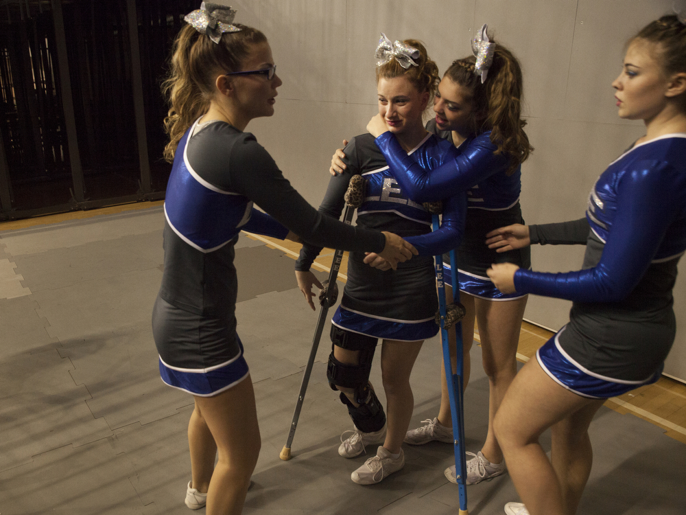 Cheer State Final Published April 2, 2015 at 1000 × 750 in Cheer State Final Robert E. Lee High School’s Gabby Sansom, who tore her ACL and meniscus in a previous competitio, is comforted by her teammates before they started their state finals routine without her in Richmond on Saturday, Nov. 8, 2014.