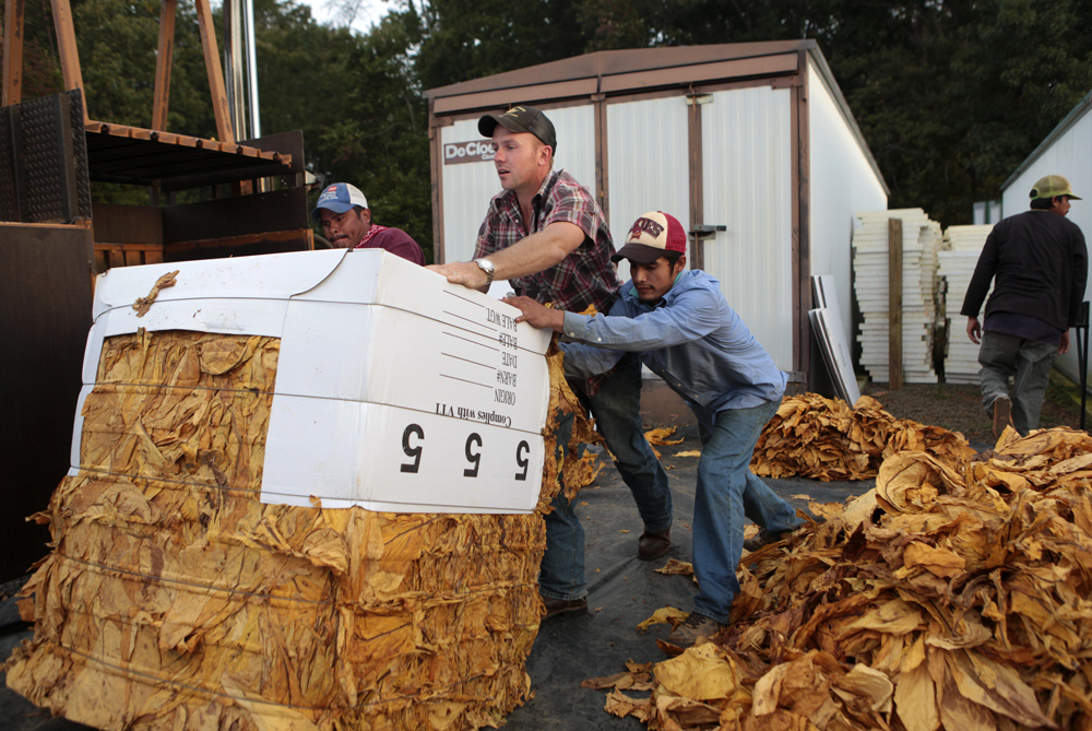 Taylor Ray Amos, 28, center, flips a bale of tobacco with temporary workers Jose Luis Galarza Zuniga, left, and Jose Manuel Hernandez Herrera, right, on Wednesday, Oct. 8, 2014 to load onto a lift that will place it onto a trailer. Amos had about thirteen workers from Mexico helping him that morning, packing anywhere from 630 to 800 pounds of flue-cured tobacco in one bale. They made about 12 bales of tobacco in the morning before heading back into the field to pick more tobacco. He has about less than half of his tobacco fields to harvest.