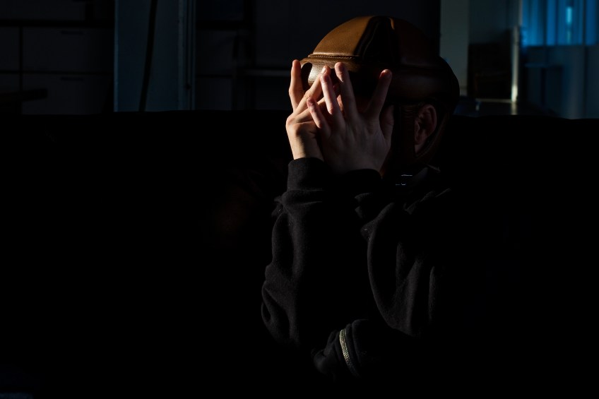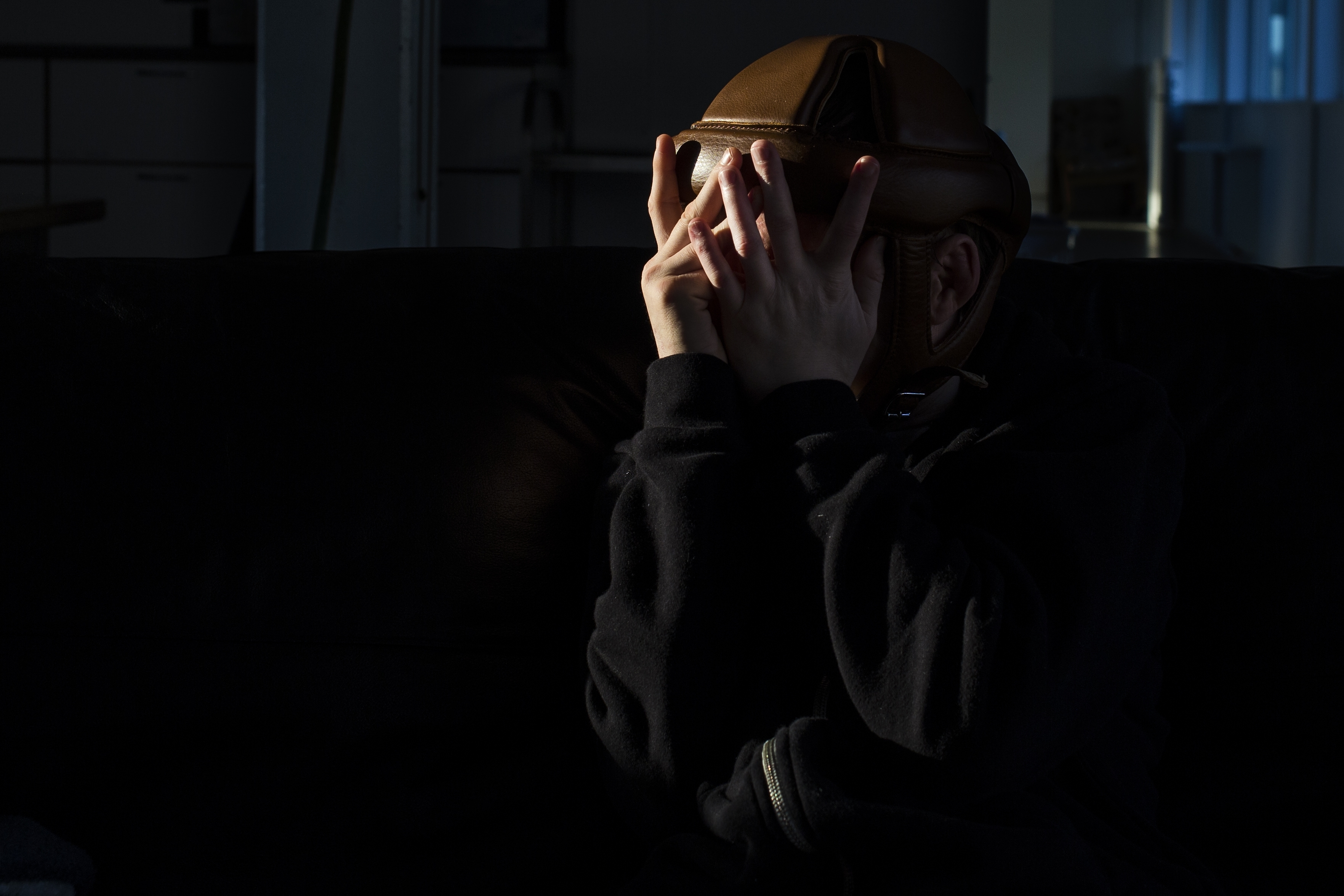 Caption 1: Kenth hides behind his hands in the common room of his home at Solund. When the staff members are switching shifts, Kenth can regularly be found waiting for the next caretaker by the door.