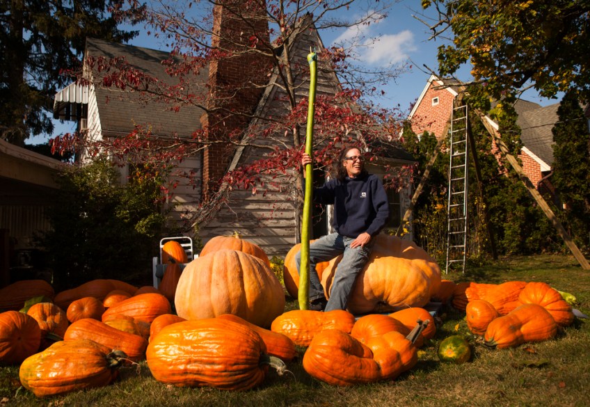 Holding a nearly eight-foot tall “long gourd” Stephen Wright sits amid giant homegrown pumpkins on display for Halloween at his home in Waynesboro. Wright recently won a pumpkin competition at the North Carolina State Fair with an 808.5-pound behemoth.
