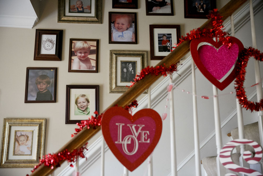Family pictures line the wall of the Saville family in Virginia Beach, Va., on Tuesday, Jan. 31, 2017. Stacy and Bill Saville have had two children born with spinal muscular atrophy, a rare genetic condition. Their daughter, Morgan, passed away from the condition in 2005.
