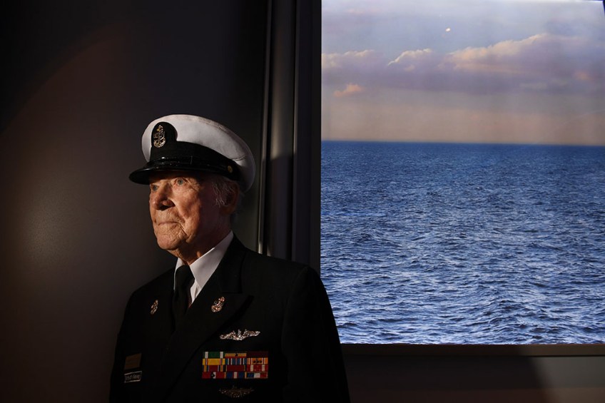 1st PLACE PORTRAIT: MATT MCCLAIN, WASHINGTON POST–World War II veteran, Hank Kudzik, 93, poses for a portrait at the Naval Heritage Center following the “Sea of White” ceremony that remembers the Battle of Midway at the United States Navy Memorial on Tuesday June 05, 2018 in Washington, DC. Kudzik served on the USS Nautilus (SS-168) submarine during the Battle of Midway.