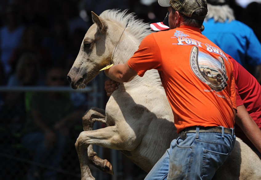 A Chincoteague Pony foal rears back on its handlers as it is shown at auction on Thursday, July 30, 2015. Each year a portion of the Chincoteague Pony herd is auctioned off to benefit the Chincoteague Volunteer Fire Company, which owns and maintains the herd.