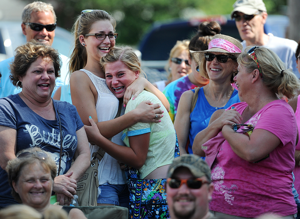 Emily Broeker, right, celebrates with her friend Emma Sykes after placing the winning bid on a Chincoteague Pony foal during the 90th annual Chincoteague Pony Auction on Thursday, July 30, 2015. Each year a portion of the Chincoteague Pony herd is auctioned off to benefit the Chincoteague Volunteer Fire Company, which owns and maintains the herd.